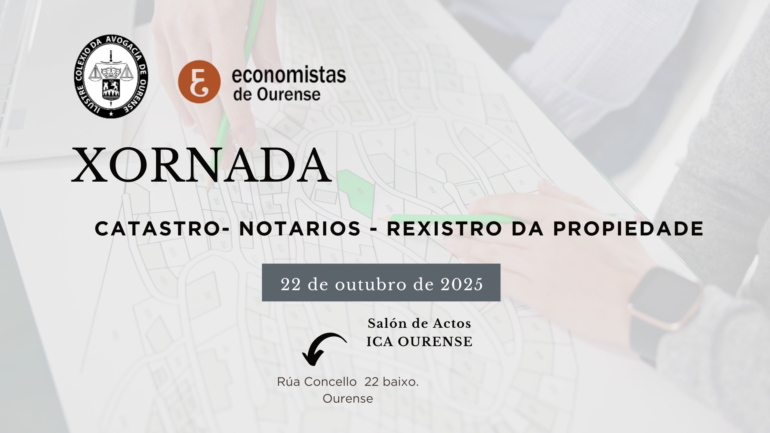 O Ilustre Colexio da Avogacía de Ourense e o Ilustre Colexio Oficial de Economistas de Ourense organizaron conxuntamente a Xornada «Catastro – Notarios – Rexistro da Propiedade», que se celebrará no salón de actos do Ilustre Colexio da Avogacía de Ourense o vindeiro 22 de outubro de 2025.